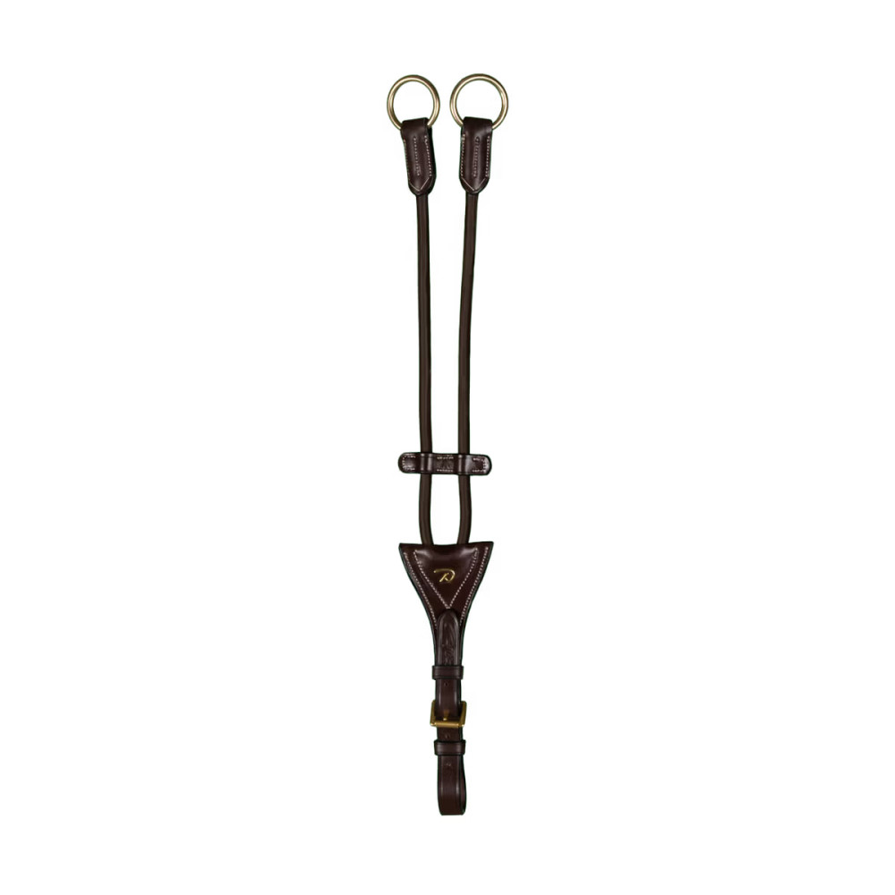 Еластичний мартингал трикутник з круглим еластичним шнуром діаметром 8 мм та кільцями, рознесеними за допомогою шкіряної смуги, яка вільно ковзає вгору та вниз по ременях.Така конструкція забезпечує м'яку дію та більшу свободу рухів для коня.Мартингал кріпиться до підперс'я або нагрудника за допомогою роликової пряжки, гарантуючи надійну фіксацію та зручність регулювання.