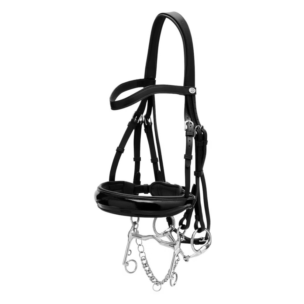 Подвійне мундштучне оголов'я з широким матовим капсулем і м'яким V-подібним налобником.Анатомічний капсуль з м'якої шкіри забезпечує комфорт та точну посадку.Капсуль доступний у лакованій шкірі.Застібка pull-back закріплена на м'якій захисній підкладці для додаткового комфорту та рівномірного розподілу тиску.