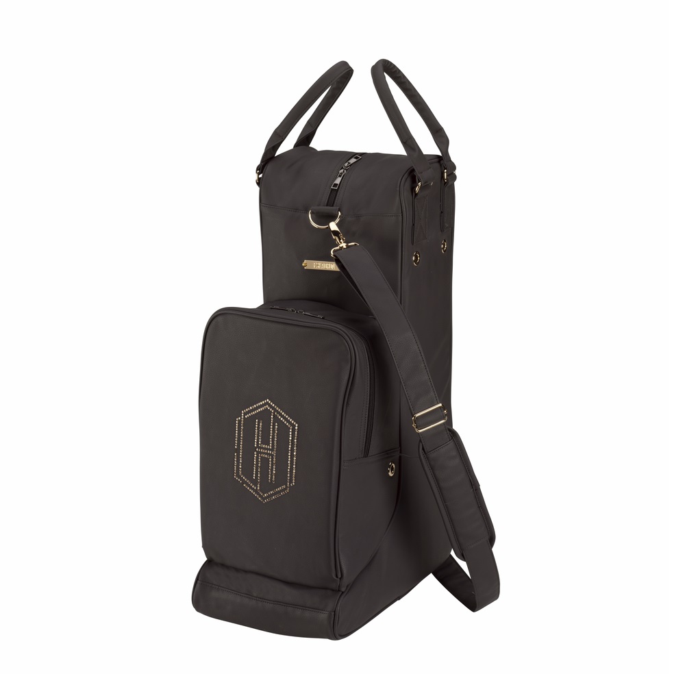 Стильна сумка для чобіт і шолома виконана з якісної штучної шкіри з м'якою підкладкою зі штучного хутра всередині, що забезпечує дбайливе зберігання екіпіровки.Всередині передбачено окреме відділення для верхових чобіт з перегородкою та застібкою-блискавкою, а також окремий відсік для шолома з блискавкою та внутрішньою кишенею.Для зручності перенесення сумка оснащена ручкою та двома регульованими плечовими ременями з м'якого софтшелу.Із зовнішнього боку розташована спеціальна кишеня для хлистів, а вентиляційні люверси забезпечують циркуляцію повітря.Дно захищене чотирма пластиковими ніжками, що запобігають зносу.Дизайн доповнений кристальною емблемою Heritage та витонченою металевою фурнітурою золотого кольору.Розміри: висота 60 див, ширина 20 див, глибина 35 див.Матеріал: 100% PVC.